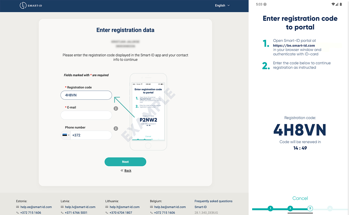 On the Smart-ID portal, answer a few questions. Enter the registration code from your app (valid for 15 minutes).